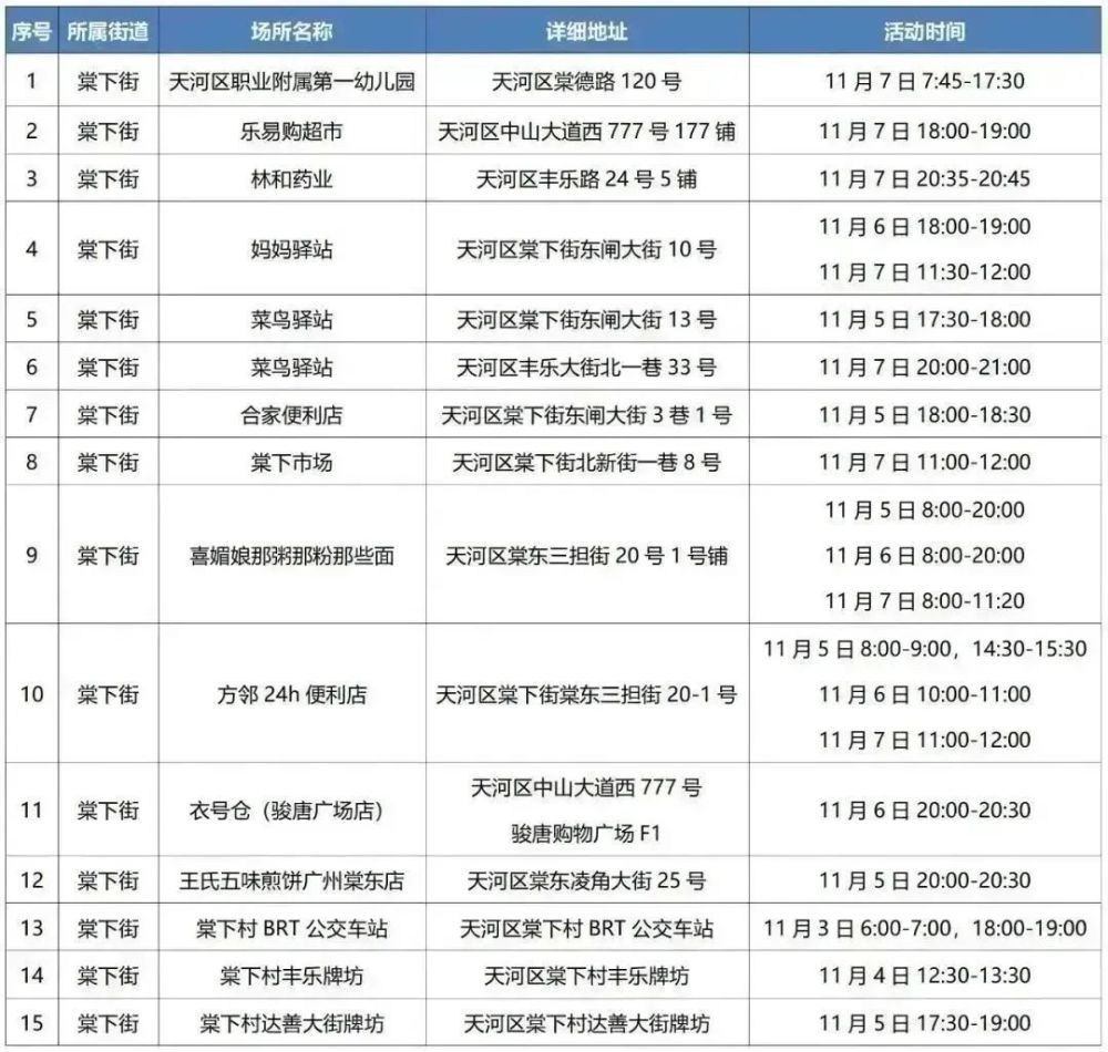 棠下街道:上社横街上景园、棠汇生活超市(棠下店)、丰乐荟超市、棠下5号网格核酸采样点;