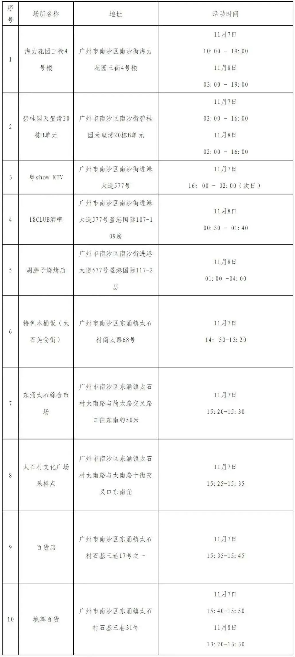 因新冠疫情防控需要,请在相关时段到过南沙区下述重点场所的人员,立即向所在社区(村居)联系报备,严格落实“3天3检”,并配合做好疫情防控各项措施。若不如实申报,不落实防控措施,造成严重后果的,将承担相应法律责任。