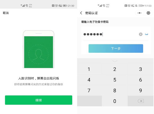 (五)微信首次登录领取电子社保卡输入微信支付密码,通过人脸识别进行实名认证;或输入电子社保卡密码(电子社保卡初始密码为生日的后六位或000000)进行身份认证登录。