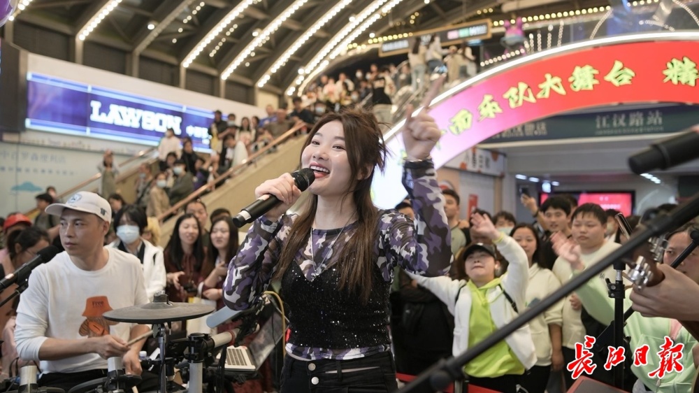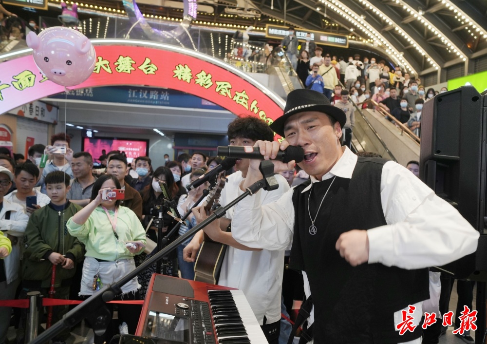“咕噜咕噜锤,咕噜咕噜叉,咕噜咕噜三娘娘管金叉。”4月1日晚上,热干面乐队在位于江汉路的Happy站台再次唱响他们的主打歌《武汉话》。“在武汉,我们把奶奶叫太,在武汉,我们把外婆叫家家……”富有武汉地域特色的音乐吸引了川流不息的人群纷纷拿出手机拍摄,而两边的楼梯上更是站满了观众,很多人都不由自主地跟随主唱coco陈摇晃起身体,玩起了小时候的划拳游戏。一个推着童车的阿姨哈哈笑着跟姑娘说,“记不记得,你们小时候总是玩这个。”转而又低下头对童车里的小男孩说,“听到冇,学说武汉话,叫家家。”