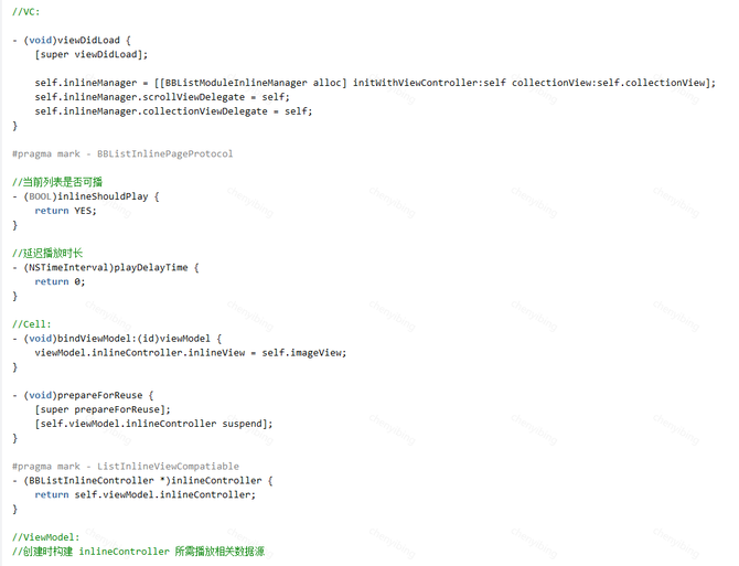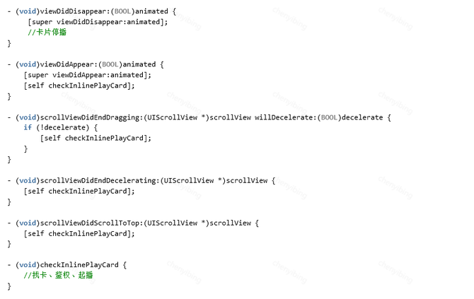 内部监听了vc的生命周期方法,在相应的生命周期回调时,通知 ModuleInlineManager 进行起播停播操作持有 tableView/collectionView 的delegate,当列表真正滚动停止时,将事件告知 ModuleInlineManager,同时将原有的 tableView/collectionView 相关代理方法通过 ModuleInlineManager 回调给VC,不影响其它的逻辑。