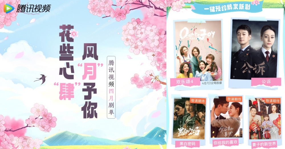 像腾讯官宣的四月剧单里就还有迪丽热巴和佟大为主演的《公诉》,王子奇、田雨、苏晓彤主演的《黑白密码》,王子奇、王玉雯主演的《你给我的喜欢》,以及袁姗姗、杜淳主演的《妻子的新世界》。