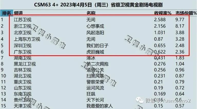 从CSM63 4+收视率数据显示可知,4月5日晚,省级卫视黄金剧场热播电视剧中,收视率排行榜前五分别如下: