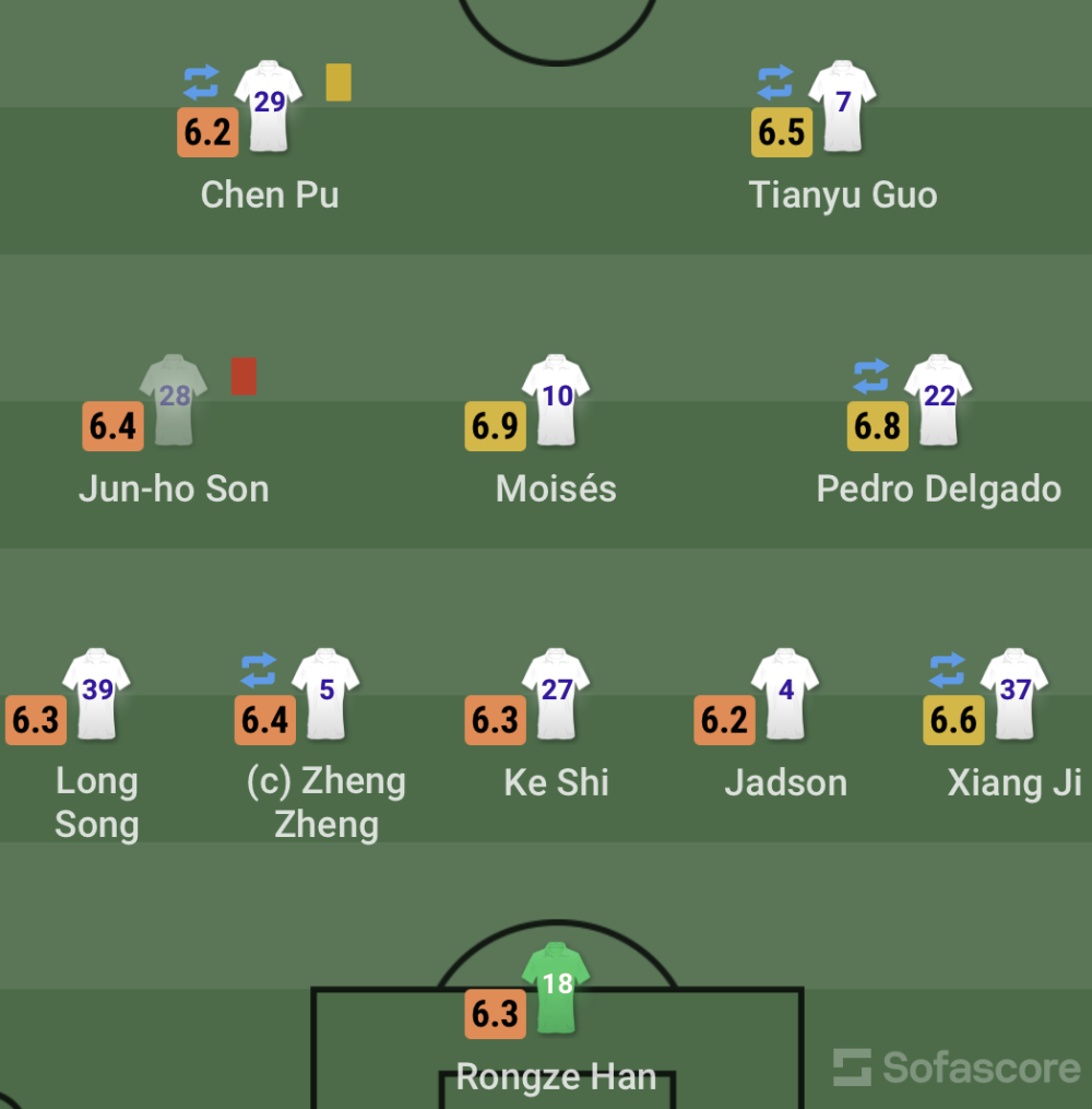 中场:37-吉翔(55'21-刘彬彬)、10-莫伊塞斯、28-孙准浩、39-宋龙