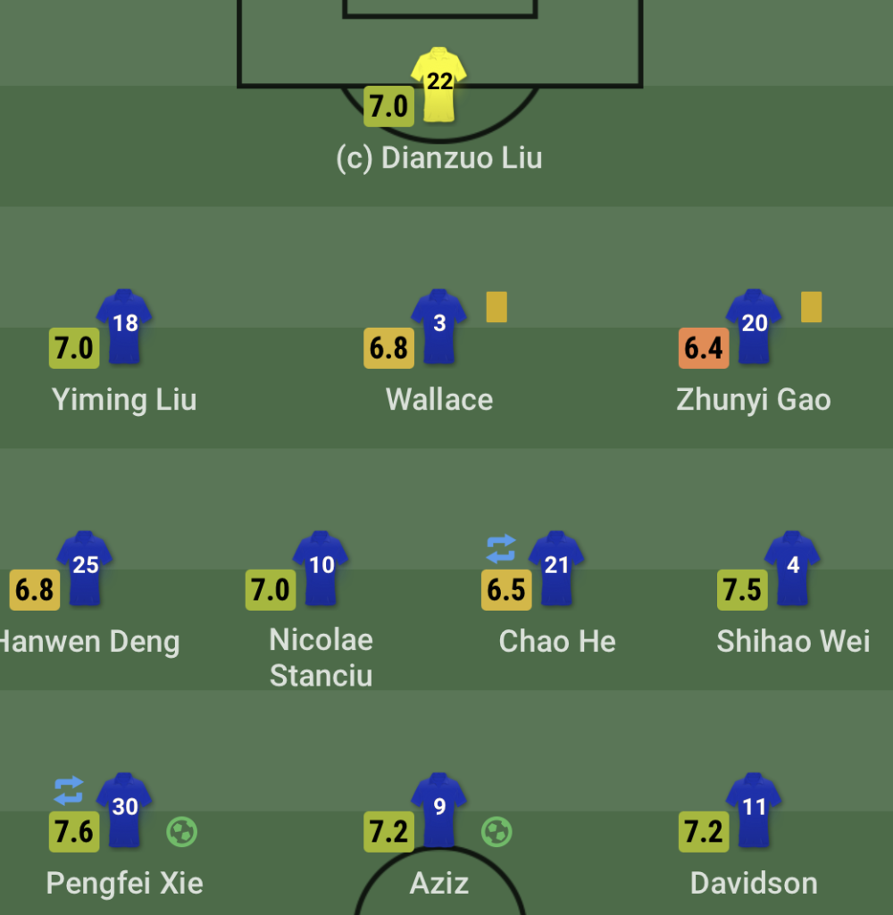 中场:10-斯坦丘、21-何超(78'12-张晓彬)、30-谢鹏飞(68'8-严鼎皓)