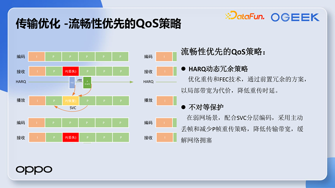 (1)拥塞控制优化方案:OPPO 的 RTC 基于 WebRTC 演进,控制算法是基于 GCC 的优化方案,在低时延的预算情况下,媒体传输在发生网络拥塞时降低一些码率,避免发生更严重的网络拥塞,减少丢包重传及时延上升。