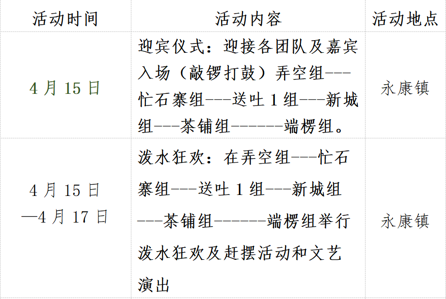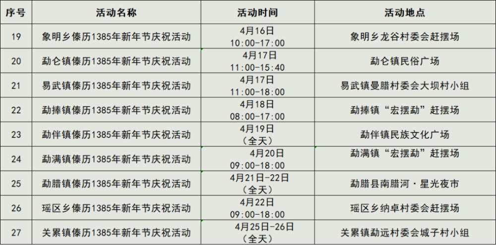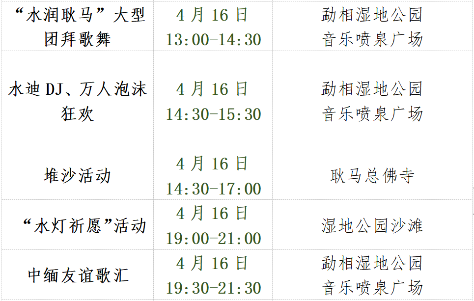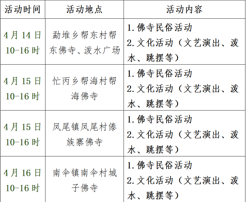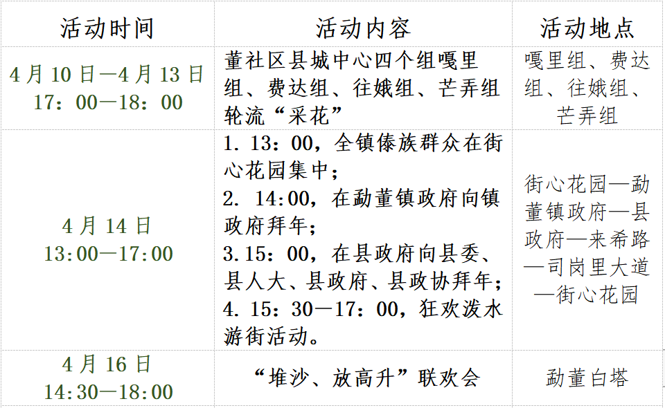 内 容:举行乡镇泼水节姐相分会场庆典活动(嘎光、民间文艺表演、对歌等)