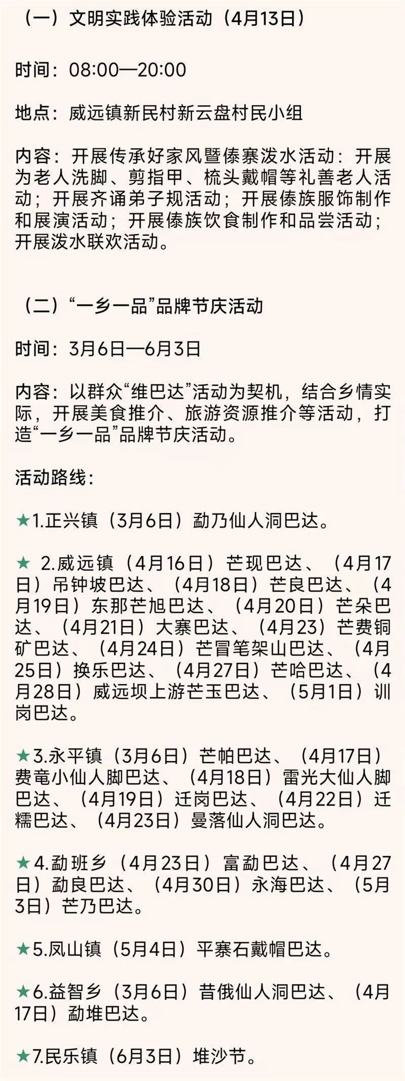 分会场(“维巴达”活动):威远镇、永平镇、正兴镇、民乐镇、凤山镇、勐班乡、益智乡