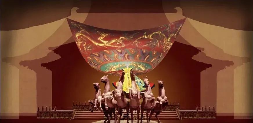 大云经与佛像在情节上是推动武后登基的关键,因此设计中以敦煌壁画的鸟兽、楼阁、飞天等元素贯穿全剧,增添了颜色的饱满度以及画面的厚重感。而尾声则用立体肌理材质制作出马匹形象,创造天子驾六马的时空交错,为武则天开天辟地成为女帝完美收尾。