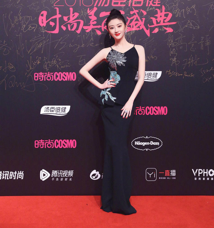 活动中的景甜身穿一袭黑色吊带裙,修身设计完美烘托出婀娜多姿、凹凸有致的身形,小V领的设计更是格外性感撩人,前胸上独特的花朵形状外加钻石点缀,不仅让剪裁普通的套裙瞬间提升质感,展现高级魅力,还给深色系的布料提亮了不少,与景甜独特的优雅相得益彰!
