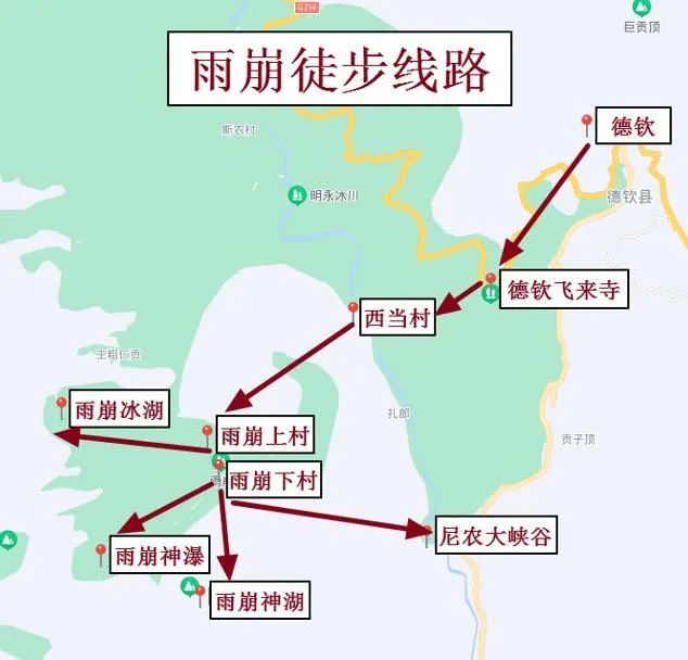 雨崩分为上下村,上村可通往冰湖,而雨崩的下村可通往神瀑、神湖、尼农大峡谷。