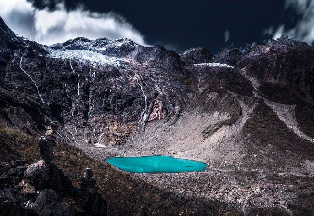 冰湖是梅里雪山冰川融化后的雪水共同汇集而成的,湖水异常冰冷,呈深绿色,如翡翠一般。