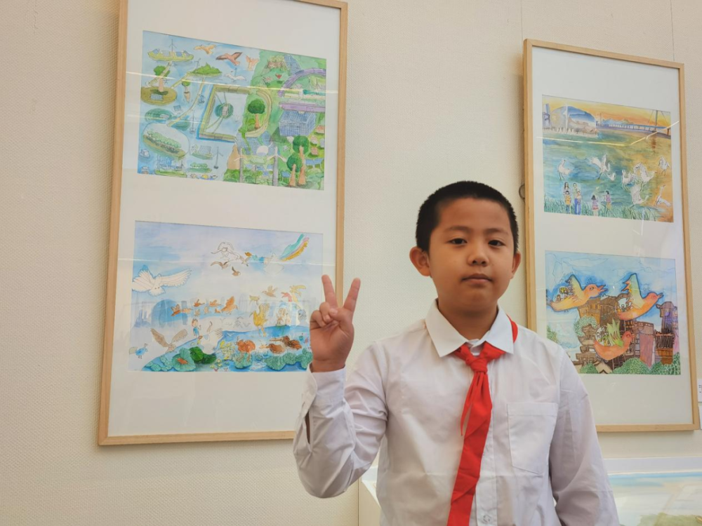 看到自己的画作被精心装裱、展示在首都的美术馆里,深圳市龙岗区百外世纪小学的苏浩易骄傲地比起胜利手势拍照。他告诉深圳卫视直新闻记者,“这幅画名叫《未来碳中和世界》,一半是海洋一半是陆地。我想象海洋上有许多种满植物的浮岛,陆地上有能产生清洁能源的工具。我画了2天呢。”苏浩易说,深圳的许多山上有风力发电“大风车”,这给了他绘画的灵感,他希望科技保护自然,自然拥护科技。