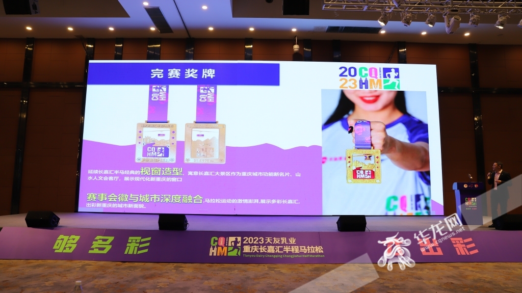 发布会上,本次比赛的完赛奖牌和参赛T恤首次亮相。半程项目的完赛奖牌延续了首届经典的视窗造型,将重庆市花山茶花,朝天门、长江索道、大剧院等地标景观与赛事会徽融为一体,在两江交汇的盛景中集中展示,寓意长嘉汇大景区作为重庆城市功能新名片,是展示现代化新重庆的窗口。