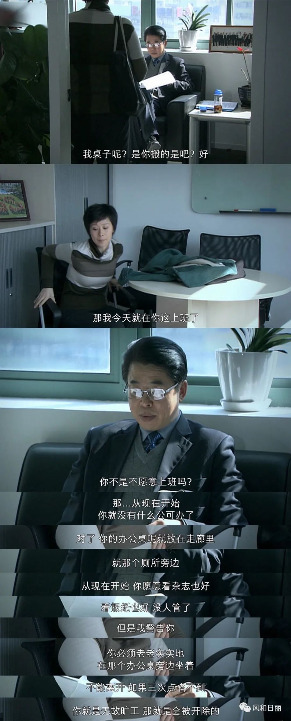公司开始像容嬷嬷一样,用各种细软的折磨方式,让你生不如死。老板把海萍的工作架空,搬到洗手间旁边的走廊,让她接受社会性死亡的待遇,还要按点签到,否则还有惩罚。