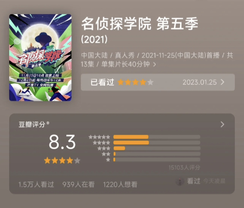 是一档大型益智类解密互动真人秀。邀请有实力的高能学霸、艺能达人入住神秘村落,围绕六个情节跌宕起伏的主题故事,展开六场前所未有、超乎想象的探索之旅。第五季开播了,好多学分姐妹好像都不是特别满意,因为新成员的加入让很多老粉感到不适应,在节目还没有播出的时候就产生了很多争议。我就直接看的加长版,正片?母带plus我看后觉得还不错,特别有两期大家都找到线索了还熬夜推凶,推凶之夜不错,竞速游戏名场面也特别多。