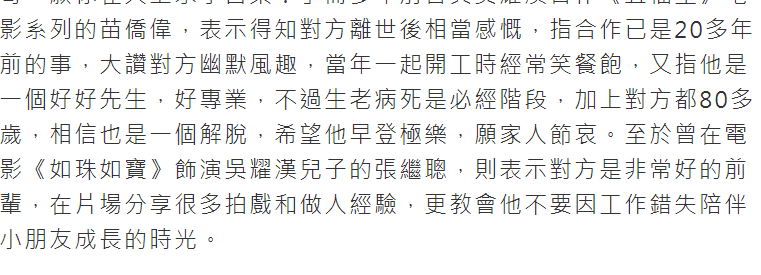 多年前曾与吴耀汉合作《福星》电影系列的苗侨伟,表示得知对方离世后相当感慨,指合作已是20多年前的事,大赞对方专业、幽默风趣,是一个好好先生,“生老病死是必经阶段,加上对方都80多岁,相信也是一个解脱,希望他早登极乐,愿家人节哀。”
