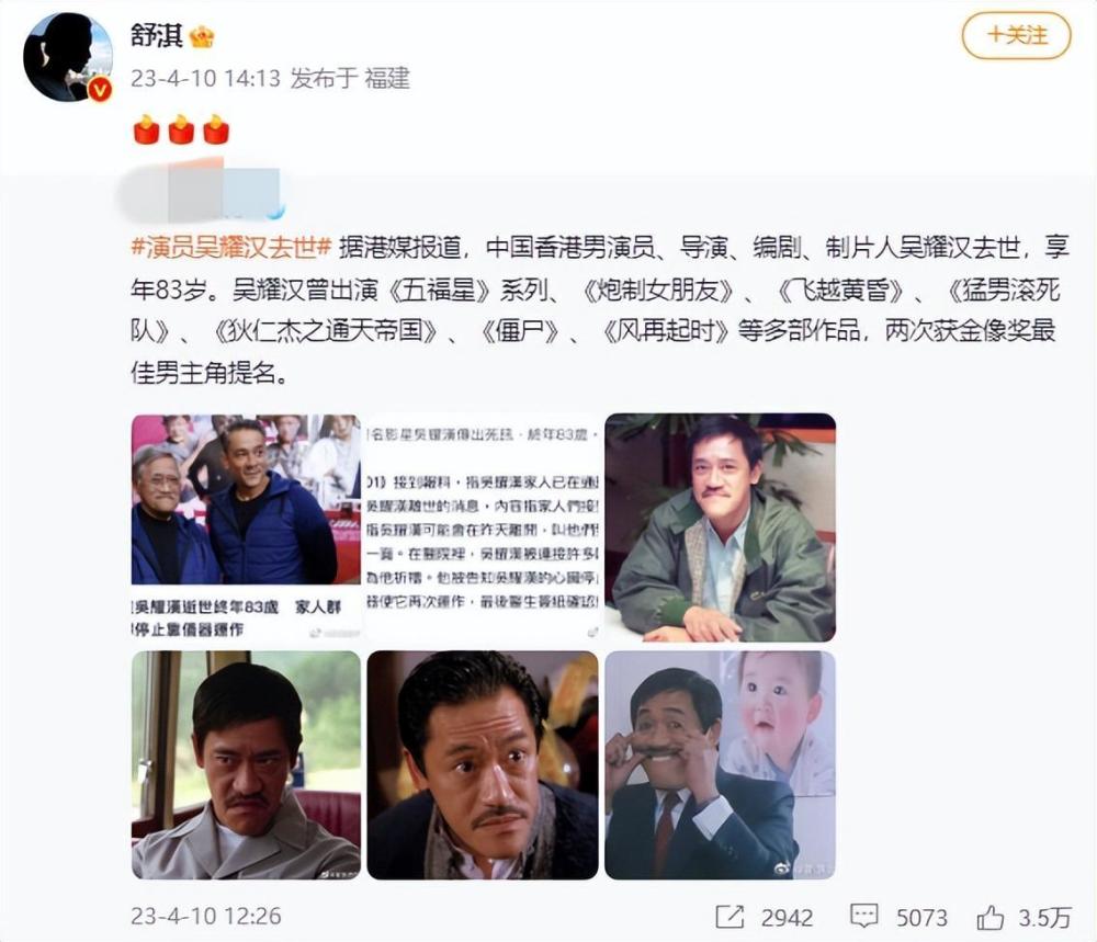 消息曝光,吴耀汉好友冯淬帆在社交网发文指,“惊闻吴耀汉辞世,伤感至极!老哥是我在香港极少数有感情的朋友,想不到已无再聚之缘!理查老哥,愿你在天上永享喜乐!”