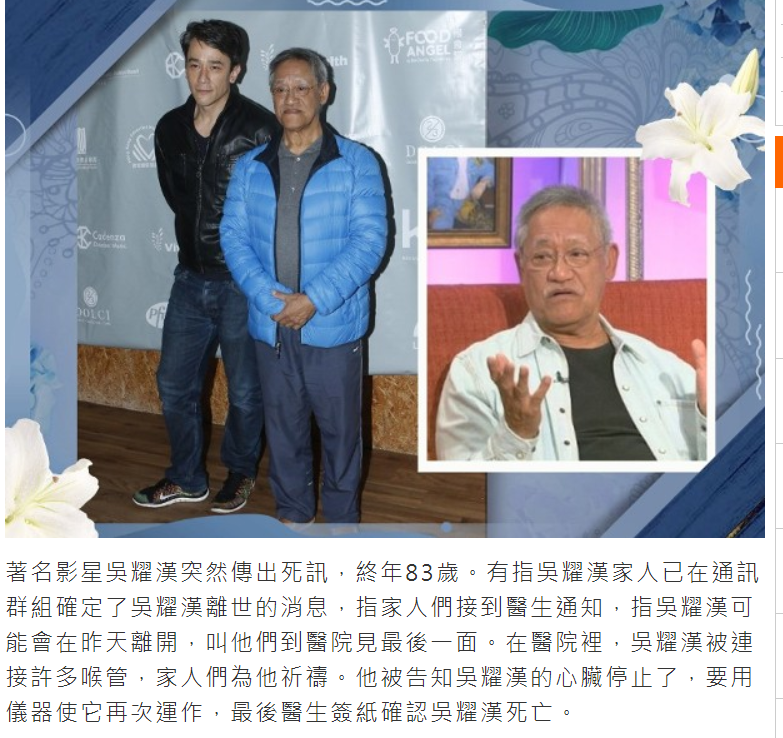 港媒指,吴耀汉的家人已经在手机聊天群组证实消息,而吴耀汉离世前,处于昏迷状态,家人早有心理准备。