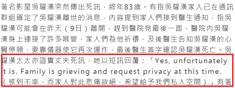 吴耀汉妻子则用短信回复记者,亲证丈夫死讯,“Yes, unfortunately it is. Family is grieving and request privacy at this time.(死亡是不幸的事实,家人对此悲痛欲绝,希望给予我们私人空间)”