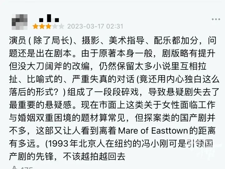今年,冯导又拿出了一部悬疑剧《回响》,豆瓣也仅仅得到了6分的及格分。四成的观众给了三星评分,称台词拿腔拿调,剧情也不够接地气。