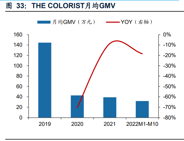 受疫情影响,线下潮流店发展暂时承压,随着形势转好美妆零售店将迎来复苏。 由于疫情控制措施的实施,导致化妆品需求减少、门店营业时间缩短及客流量减少, 根据KK集团招股书,THE COLORIST的单店月均GMV由21年的39.0万元下降至22 年前十月的31.8万元。在防疫政策调整和疫情恢复大背景下,实体经济或迎来复苏 机会,预计美妆潮流零售店线下销售将得到提升。根据KK集团23年1月月报,线下 美妆市场恢复势头明显,THE COLORIST 1月单店GMV同比增长超40%,单日业绩 创480天新高,单月GMV创23个月新高。未来随着线下门店客流量得到恢复,彩妆 品作为易耗品且随着潮流更新频率快,消费者购买频率较高,对于彩妆的需求端旺 盛;另外THE COLORIST等新型美妆集合店通过提供试用更加方便消费者挑选购买, 将为彩妆品牌带来更大的复苏机会。