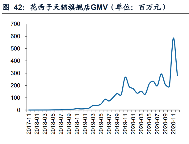 2019年为花西子关键转折年,与李佳琦深度绑定后GMV提升显著。2019年双十 一期间,花西子64%的GMV来源于李佳琦直播间交易,其中直播间中主打的空气散 粉成长为店铺爆款单品,19年4月-20年4月销量列店铺第一,单品销售额超过7.1亿, 占比超过50%;雕花口红19年4月上市后成为天猫阅读销量增速第一的爆款产品,19 年4月-20年4月销售额超过1.5亿,占比第二。