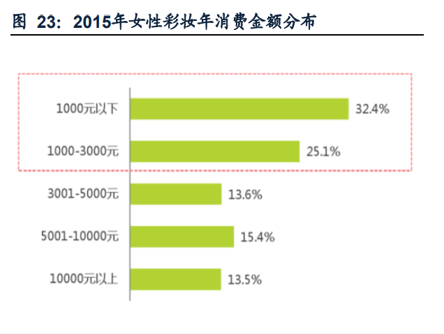 具体到彩妆,这一时期的彩妆消费以平价为主,国产彩妆在二线城市渗透率较 高。根据艾瑞咨询,2015年我国女性护肤年消费金额分布较为平均,各价格带占比 均在20%左右,对比而言,约60%女性的彩妆年消费金额在3000元以下,我们认为 可能是由于彩妆迭代速度快、单个产品使用率不高,导致消费者购买时更倾向于选 择低价产品。分品牌国别看,无论在哪个线级城市,我国女性对彩妆品牌的购买率 顺序均为欧美>日韩>国产,且城市等级越高越钟爱欧美品牌;国产彩妆购买率整体 在30%左右,消费者对国货彩妆品牌的认知度还有较大的提升空间。