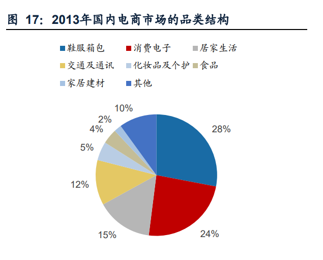 电商平台进入流量汇集阶段,线上渠道为化妆品市场发展打开广阔空间。电商 1.0阶段,交易模式以C2C为主,较为分散且缺乏规范性,消费者网购主要是寻求低 价,对产品质量和品牌没有较强的概念和要求,品牌商对线上渠道的定位以清理尾货为主。2011年左右电商发展进入2.0阶段,一方面,电商所需的支持性基础设施(宽 带、智能手机、3G网络等)建设更加完善;另一方面,对于许多品类来说,电商被 证明是更有效率的销售方式,根据科尔尼,2013年国内电商市场销售占比第一和第 二的品类分别为鞋服箱包和消费电子,前者主要享受电商带来的信息效率,后者主 要享受履约效率。