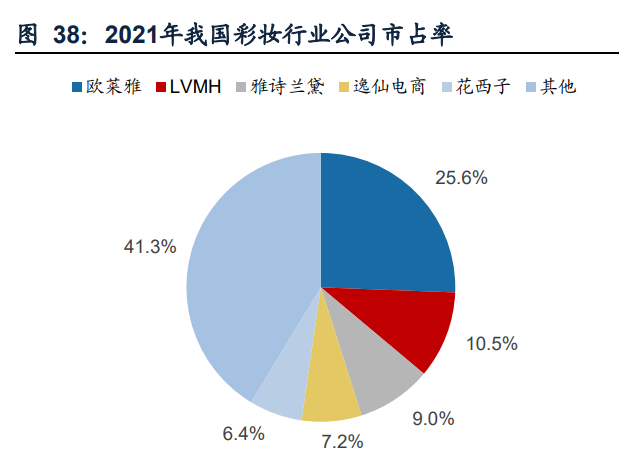 从品牌层面看,欧美品牌占据主导地位,国货品牌迅速崛起。根据彭博,2021 年我国彩妆市占率前五名的品牌为花西子(6.4%)、完美日记(6.1%)、迪奥(5.8%)、 巴黎欧莱雅(5.4%)、圣罗兰(5.0%)。2017年TOP20品牌中,欧美、日韩、国货 品牌分别占13、4、3席,合计市占率分别为46.3%、9.0%、8.7%;2021年TOP20品 牌中,欧美、日韩、国货品牌分别占13、2、5席,合计市占率分别为42.1%、3.6%、 18.7%,五年时间以来,尽管欧美品牌仍然在我国彩妆市场占据主导地位,但国货品 牌的市占率显著提升,发展速度不容小觑。 从公司层面看,欧莱雅集团的市占率遥遥领先。根据彭博,2021年我国彩妆行 业市占率前三名的公司分别为欧莱雅集团(25.6%)、LVMH集团(10.5%)和雅诗 兰黛集团(9.0%)。欧莱雅集团在我国彩妆市场的占有率多年维持在25%以上,其 旗下有美宝莲纽约、巴黎欧莱雅、3CE、YSL、阿玛尼、兰蔻、植村秀、羽西等多个 彩妆品牌;LVMH集团市占率稳定在10%左右,旗下主要有迪奥、纪梵希、娇兰等高 端彩妆品牌;雅诗兰黛集团近年来在我国彩妆市场的占有率快速提升,从2017年的5.6%提升至2021年的9.0%,主要得益于旗下两大品牌雅诗兰黛和魅可的贡献。