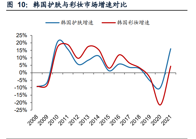 国内美容个护市场整体规模方面,参考彭博预测,预计2026年达到8177.3亿 元,2021-2026年复合增速为7.5%。 彩妆占比方面,2021年我国彩妆市场规模占整体美容个护市场的比重为11.5%, 我们预计2026年这一比重达到16%,对标韩国2011-2013年时期的彩妆占比。对比 中美日韩四个国家的化妆品市场发展情况,我们发现,中国与韩国均呈现护肤发展 带动彩妆发展的模式,韩国和中国分别以2011年和2013年为界,前期护肤增速快于 彩妆,后期彩妆增速快于护肤,而日本各年度彩妆和护肤增速基本一致,美国则呈 现出前期彩妆增速快、后期护肤增速快的相反路径,故选取韩国作为主要对标国家。 韩国彩妆发展至少领先中国十年,彭博数据显示,2007-2016年韩国彩妆占其美 容个护市场的比重处在16-20%区间,假设2026年我国彩妆占比达到16%,计算得彩 妆市场规模为1308亿元。 将以上两种方法取平均值,预计2026年我国彩妆市场规模约1275亿元,2021- 2026年CAGR约14.2%,成长性较好。