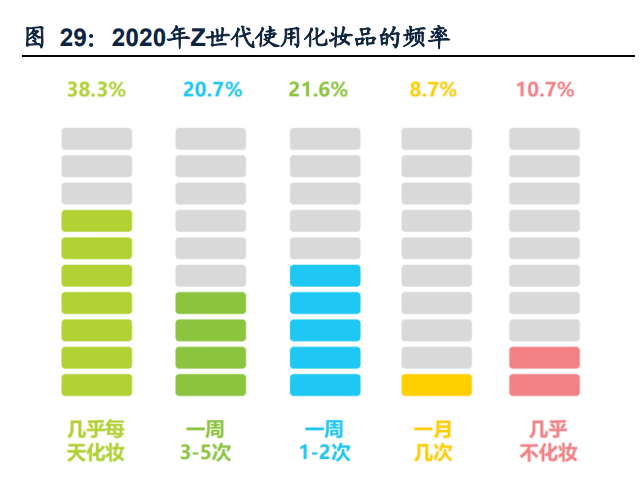 在消费需求端,Z世代崛起是彩妆实现快速发展的重要因素。彩妆的消费依赖于 人们对“美”的更强诉求,一方面,居民收入持续增长、物质生活条件改善使得人们 更加关注精神层面的需求满足;另一方面,2016年以来,Z世代核心人群(1995-2000 年出生)步入高中、大学,个性想法有更多机会表达、消费能力也逐渐增强,Z世代 的冒险和尝鲜精神与彩妆产品色彩丰富、快速迭代的特性十分契合。根据艾瑞咨询, 2020年Z世代最喜欢购买的彩妆品类是唇妆类,其次为眼妆和底妆,约38.3%的Z世 代几乎每天带妆保持好形象。此外,Z世代消费观念趋于理性,不再唯国际大牌论, 性价比、国潮热、颜值、娱乐性等成为选择品牌时更重要的考虑因素,彩妆的悦己目 的和社交价值均不断提升。