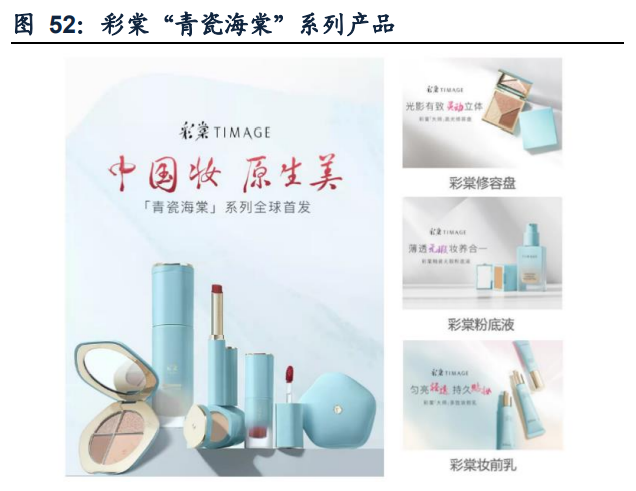 2.彩棠(TIMAGE):专业化妆师品牌,定位大众。彩棠创立于2014年,是中国 明星彩妆大师唐毅先生以中国美学为基础,结合国际彩妆风尚,专为中国面孔定制 的彩妆品牌。彩棠以“匠心定制、化繁为简、妆人合一”为品牌理念,打造实用性与 艺术性兼具的彩妆产品,助力每位女性从自身特点出发,探索独属于自己的妆容, 绽放自我的独特之美。 渠道方面,彩棠品牌目前全部为线上销售,销售平台主要为天猫和抖音。产品 方面,彩棠主打底妆品类,精简SKU,主推高光修容、妆前乳和粉底液三大底妆产 品,核心单品包括大师多效妆前乳(179元/40g)、双拼高光(159元/8g)、大师高 光修容三色盘(199元/17g)、釉瓷无瑕粉底液(189元/30ml)等。彩棠2021年实现收入2.5亿元,同比增长103.5%,毛利率接近70%,利润亏损约1000万元,主要是品 牌发展初期营销投入较大;22H1彩棠收入超过2.3亿元,同比增长超过110%,且已 实现盈利,发展前景可期;彩棠品牌营收占珀莱雅公司总营收的比重也从21年的3.2% 提升至22H1的8.9%。