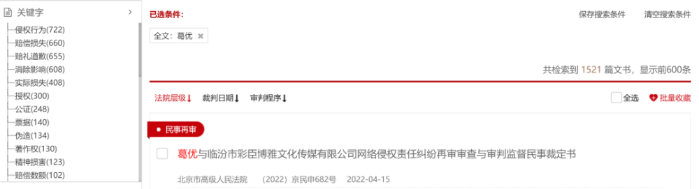 上述葛优不仅起诉了网易,也起诉了B站、海信、搜狐等公司。目前在裁判文书网中以“葛优”为关键词搜索,能检索到1521篇文书,关键字多为“侵犯行为”“赔偿损失”“赔礼道歉”“消除影响”等。其中2021年至今的文书数量达990篇。