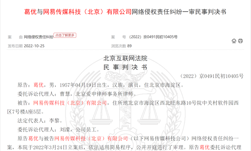 如近两年,葛优、彭于晏、“快手一哥”辛有志等人都曾起诉网易。比较典型的案例如葛优,称网易传媒在其公众号“槽值”发表的文章中,使用了19张葛优肖像照片,还植入了多个广告宣传内容和二维码,结果网易一审被判在公众号道歉,并赔偿经济损失35000元。