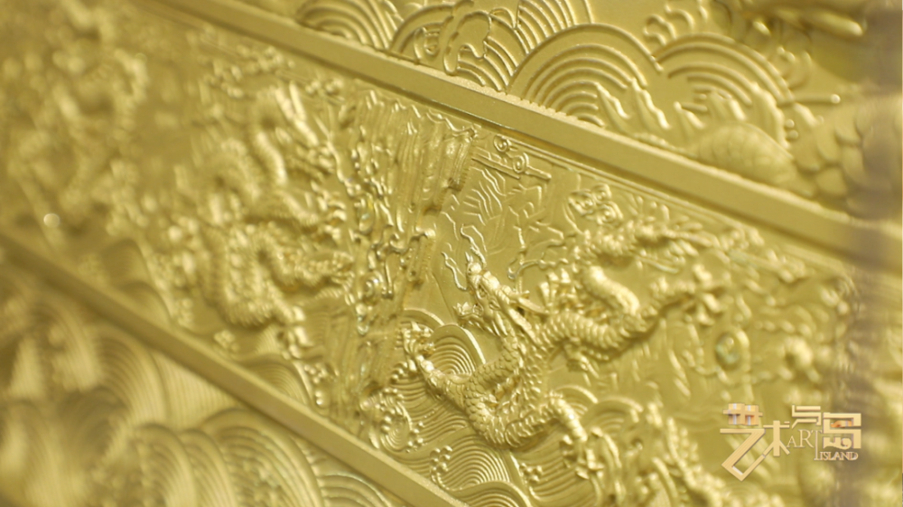 刘炜明:是的,丛老师,这是依据北海公园的九龙壁造型做的,是由一根重量达100公斤,99.999%纯度的金条一体压制成型后再经由工艺美术师手工錾刻出纹饰,这件黄金艺术品上的龙饰和我们北京北海公园的龙基本一样。