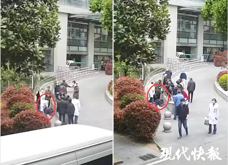 就在此时,一个白色的身影从马路对面冲了过来。从医院里的视频中可以看到,这名“白大褂”正好从外科大楼对面的走道路过,发现有患者倒地时,立即赶了过去,并着手施救。