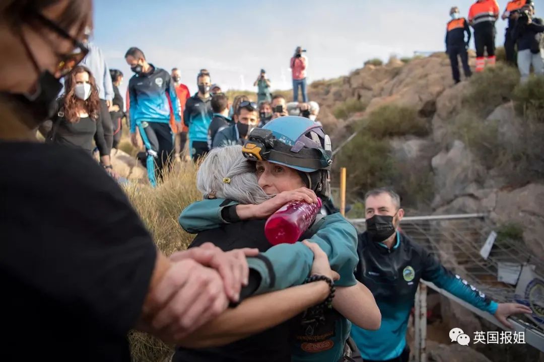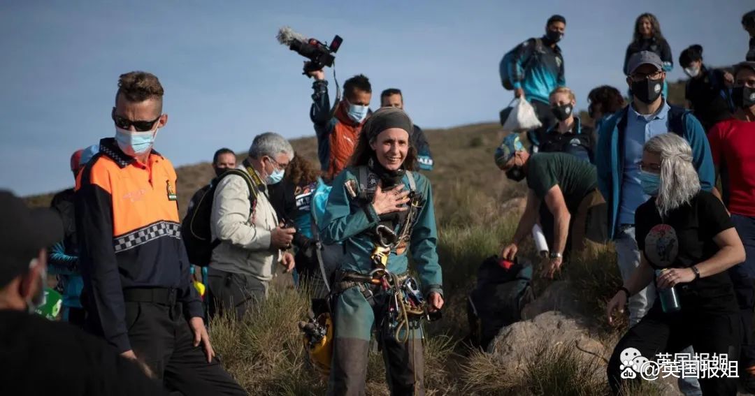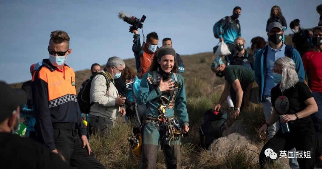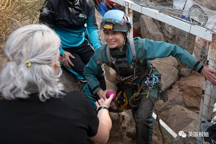出洞的那天,比特丽姿的亲朋好友和团队守在洞口。她状态不错,满脸笑容,但因为在狭小空间待得太久,走路时平衡不太好,需要人搀扶。