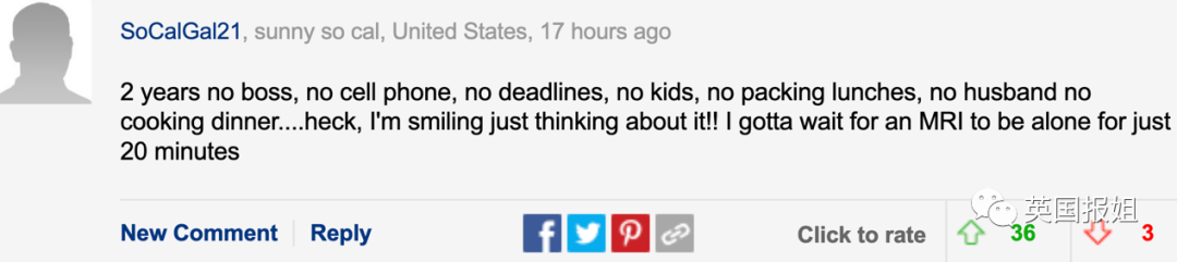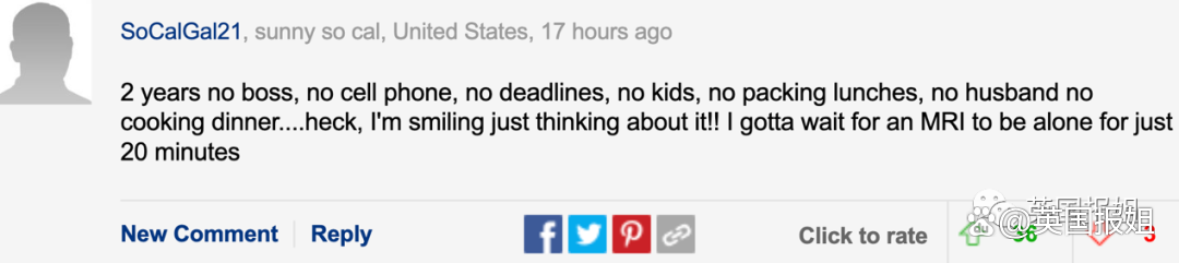 光是想想我都笑翻了!能在体检拍片子时独处20分钟我都谢天谢地了!”