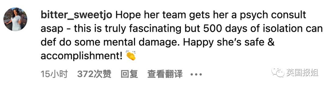 “希望她的团队快点给出心理分析结果,这研究太神奇了,但500天与世隔绝很可能损害人的心理健康吧。她平安完成挺令人高兴!”