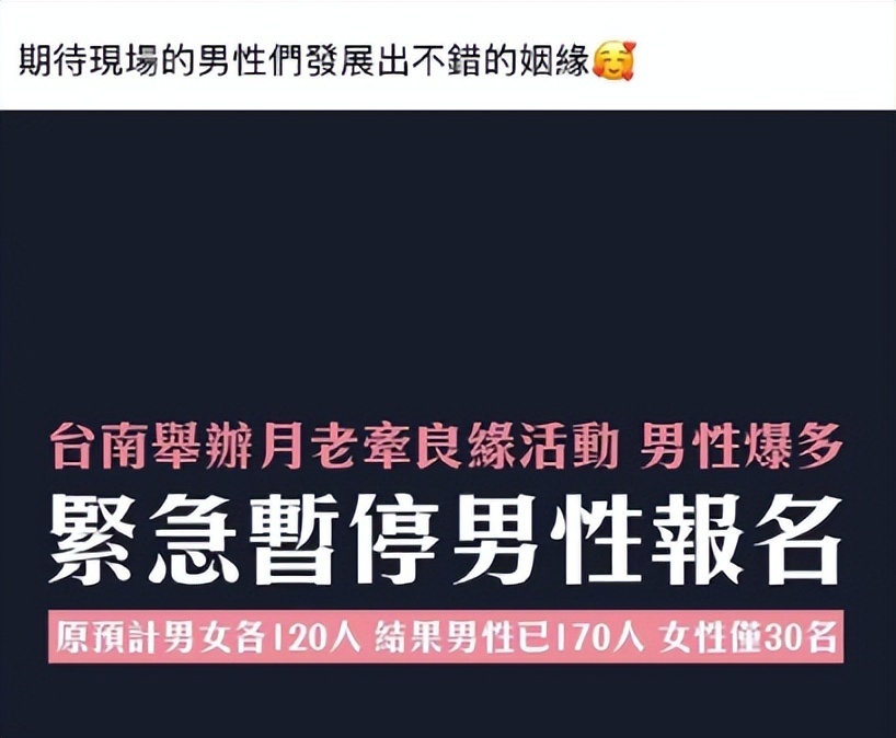 近日,台湾某地举办了月老牵红线活动,说简单一点就是相亲大会,为了促使更多人参加,活动官方还特地开放了网上预约,没想到预约的男性超过了预期的人数,无奈之下官方只好终止了男性的预约,想要等到女性预约满了就开始相亲大会。