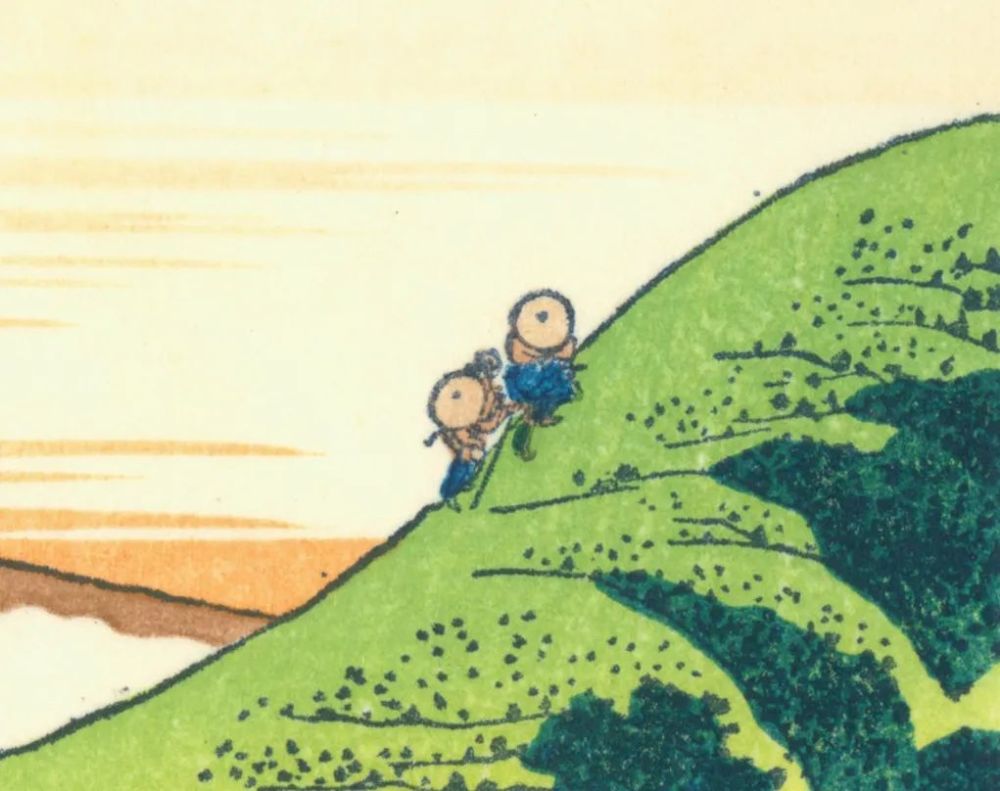 绿葱葱的山道上,有两个小人慢慢地往上攀登。在他们细小的身躯衬托下,富士山的身躯显得更加雄伟,使整体画面体现出一种经过时间沉淀的静态美。