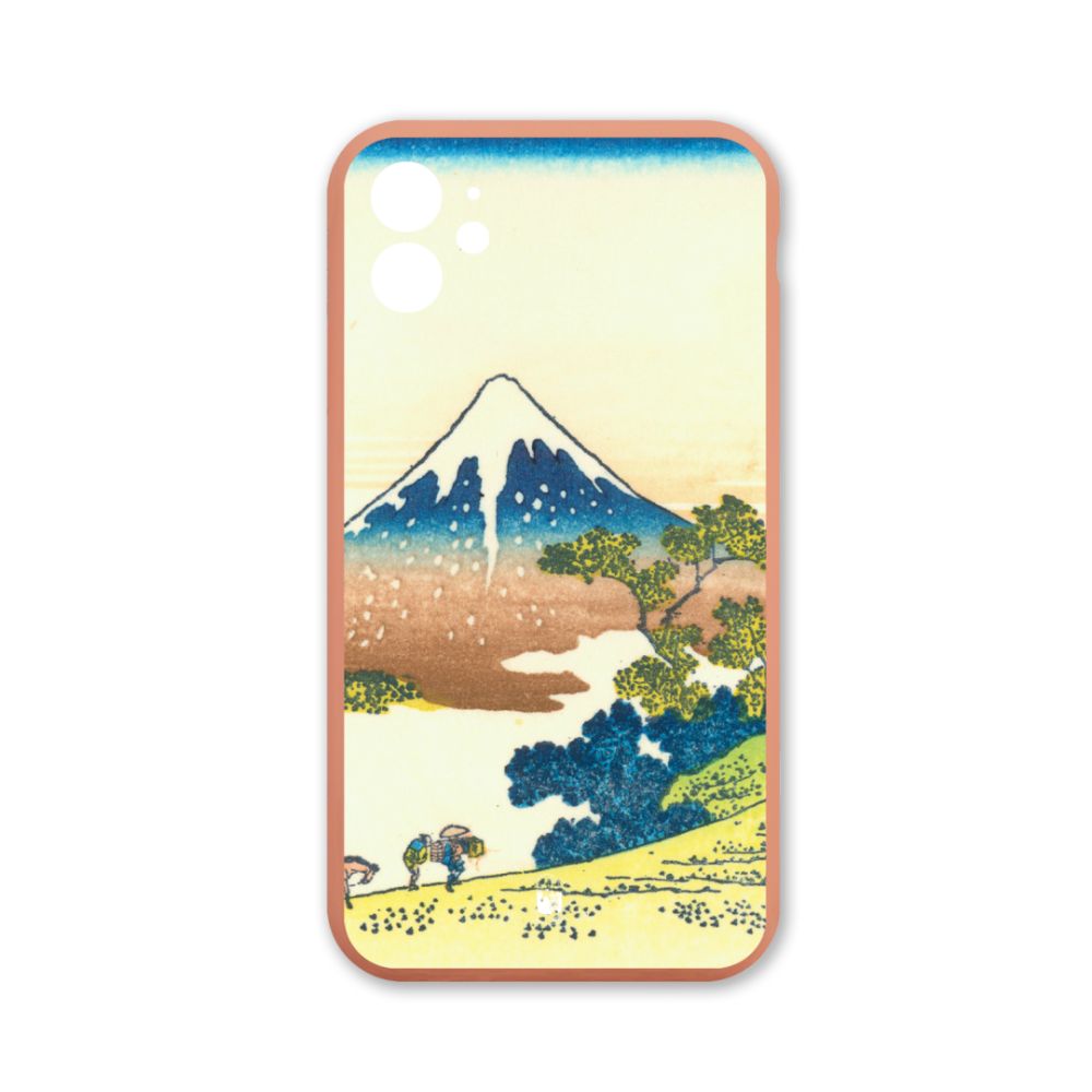 富岳三十六景的《甲州犬目峠》从犬目峠(现日本山梨县上野原市)取景, 北斋在画这辑富士三十六景时已经高达七十岁,画中以白色,蓝色和棕色三种颜色叠画出富士山的形态, 一旁绿叶如茵的林道一路蜿蜒向上,整体构图极具巧思,描绘出一幅恬静怡人的初春富士景象。