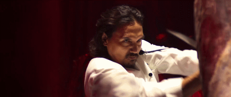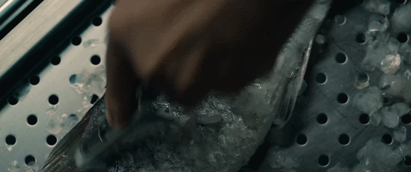 比如开场,将“饥饿”团队剖鱼、刮鳞、点酱等备餐特写,同主厨保罗抹脸、刮胡、护肤等动作进行交叉剪辑,突出全国首席美食团队的精致,以及主厨和其他人之间的地位悬殊。