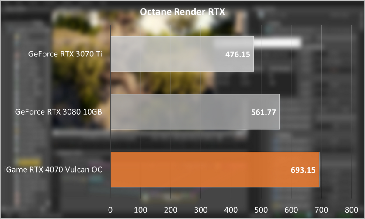 Octane Render RTX是同样是测试GPU的光线追踪性能表现,在一个复杂场景下考验GPU每秒产生的样本率,iGame GeForce RTX 4070 Vulcan OC相比GeForce RTX 3070 Ti性能提升40%,相对GeForce RTX 3080 10GB提升大约为10%左右。