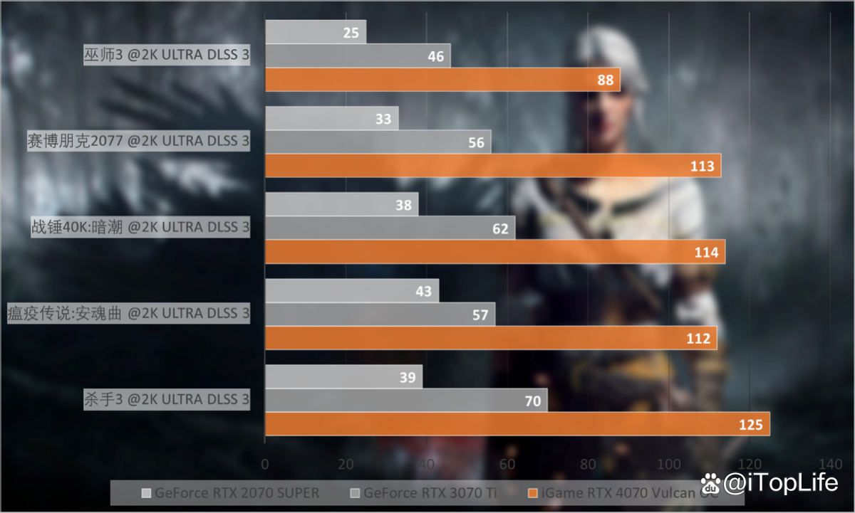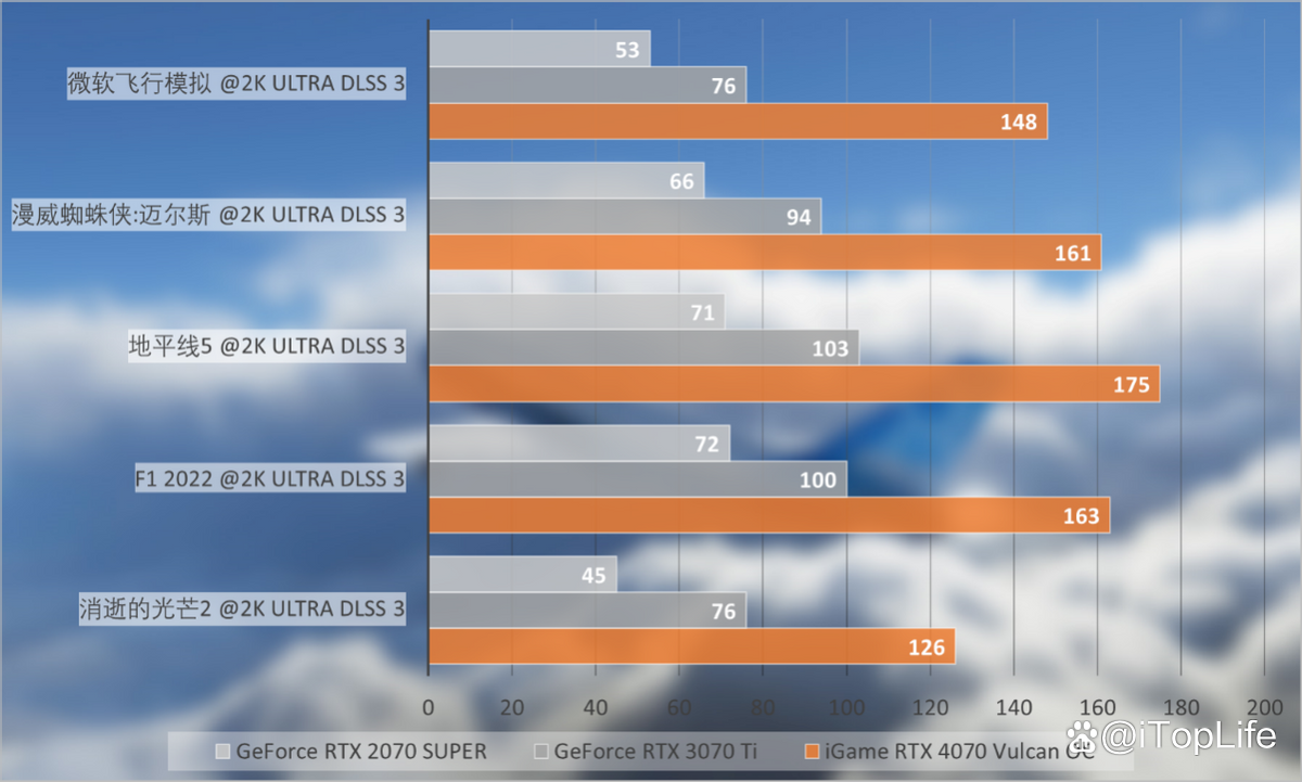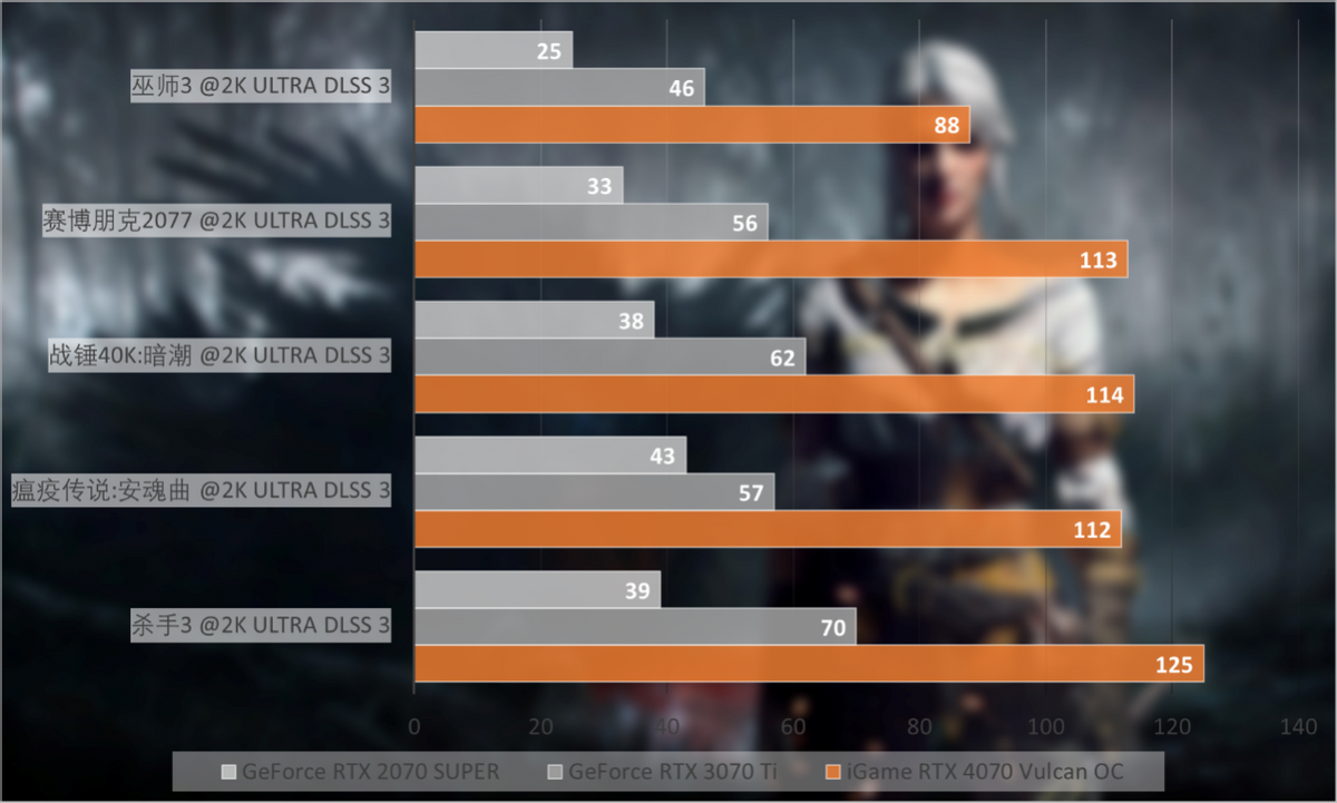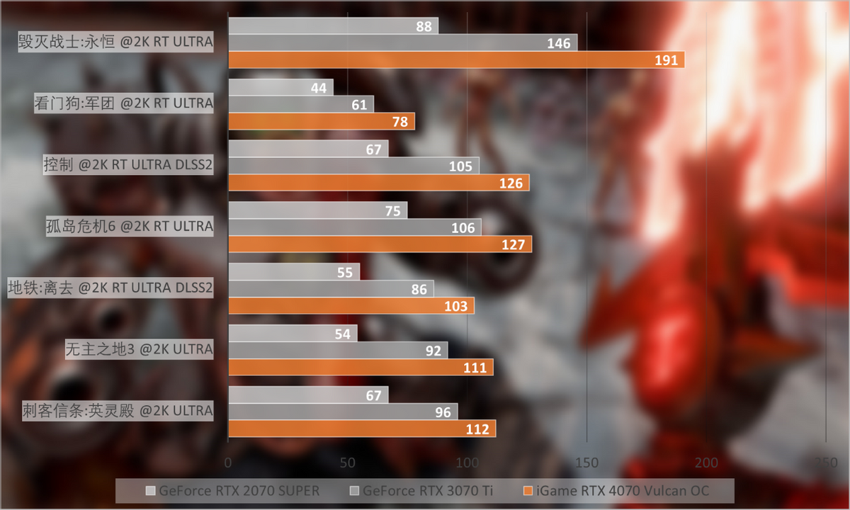 非DLSS 3游戏基准测试同样如此,可以看到iGame GeForce RTX 4070 Vulcan OC在对比RTX 3070 Ti的提升大概22%左右,对比RTX 2070 SUPER提升则可以达到100%以上。