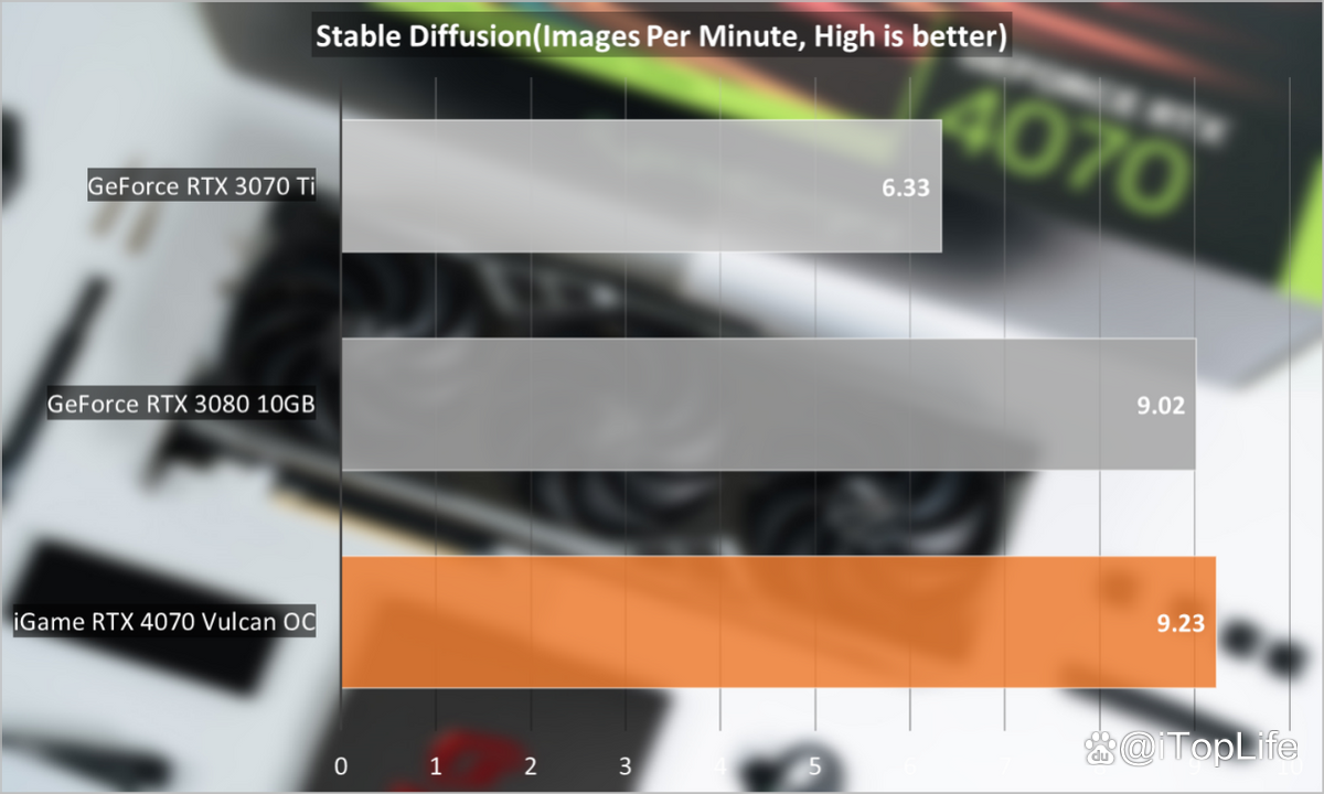 在对比中,我们使用了iGame GeForce RTX 4070 Vulcan OC与GeForce RTX 3070 Ti、GeForce RTX 3080 10GB进行参照,记录下每个GPU花费的时间,并进一步推算出每分钟生成的图像效率(Images Per Minute)。在实际对比中可以看到,iGame GeForce RTX 4070 Vulcan OC能够轻松实现于GeForce RTX 3080 10GB的性能,并且相比GeForce RTX 3070 Ti提升40%以上,也意味着同样的成果,可以为我们节省40%的时间。