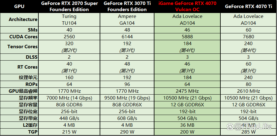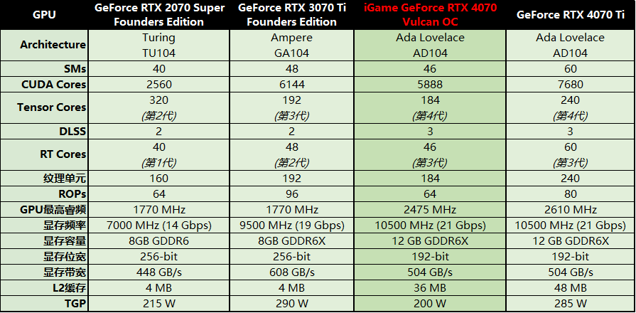 同时我们也会将iGame GeForce RTX 4070 Vulcan OC开启一键超频模式,让GPU频率达到2625MHz,并引入GeForce RTX 3080、GeForce RTX 3070 Ti、GeForce RTX 2070 SUPER根据情况进行对比。