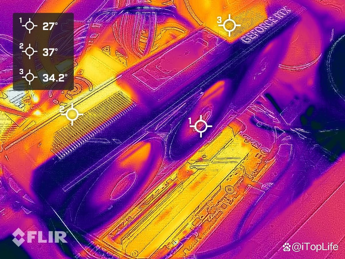 此外超扁平的密闭腔体内还充满冷凝液,吸收热量后通过相变原理散发热量,配合散热的金属中框同时也能做到加固的效果。而在实际压力测试中,可以看到GPU核心温度仅在67℃左右,比RTX 4070 Founders Edition和iGame RTX 4070 Ultra W V2都要更低,在红外线测温下,显卡外装甲在室温22℃的环境下保持着清凉的状态。