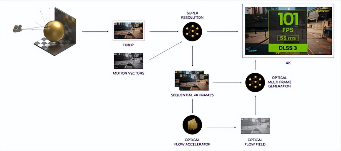 DLSS 3与我们以往所认知的DLSS不同,它包含了一套提升游戏帧率、降低系统延迟的完整解决方案。它通过引入光流加速器(Optical Flow Acceleration,OFA)与DLSS相结合的办法,构建出了一个更为立体的分析方式,将卷积自编码器的输入源扩展到几个部分,分别是:之前帧与当下帧,由光流加速器生成的光流场、游戏运动矢量和深度等数据。这时候DLSS 3甚至承担起渲染过程中7/8的工作,让CPU和GPU进完成其中1/8的渲染即可,从而节省出大量的计算资源专注到更有用的地方。